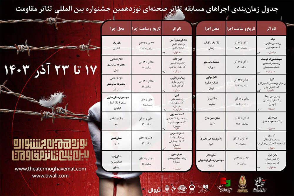 به گزارش خبرگزاری مهر به نقل از روابط عمومی نوزدهمین جشنواره بین المللی تئاتر مقاومت، برنامه هفته دوم اجراهای «مسابقه تئاتر صحنهای» و «بخش مهمان» نوزدهمین جشنواره بین المللی تئاتر مقاومت که قرار است در قالب اجراهای عمومی به میزبانی شهرهای زاهدان، شهرکرد، تهران، مشهد، شیراز، اهواز، اصفهان، الیگودرز، قم و نیشابور روی صحنه بروند، اعلام شد.