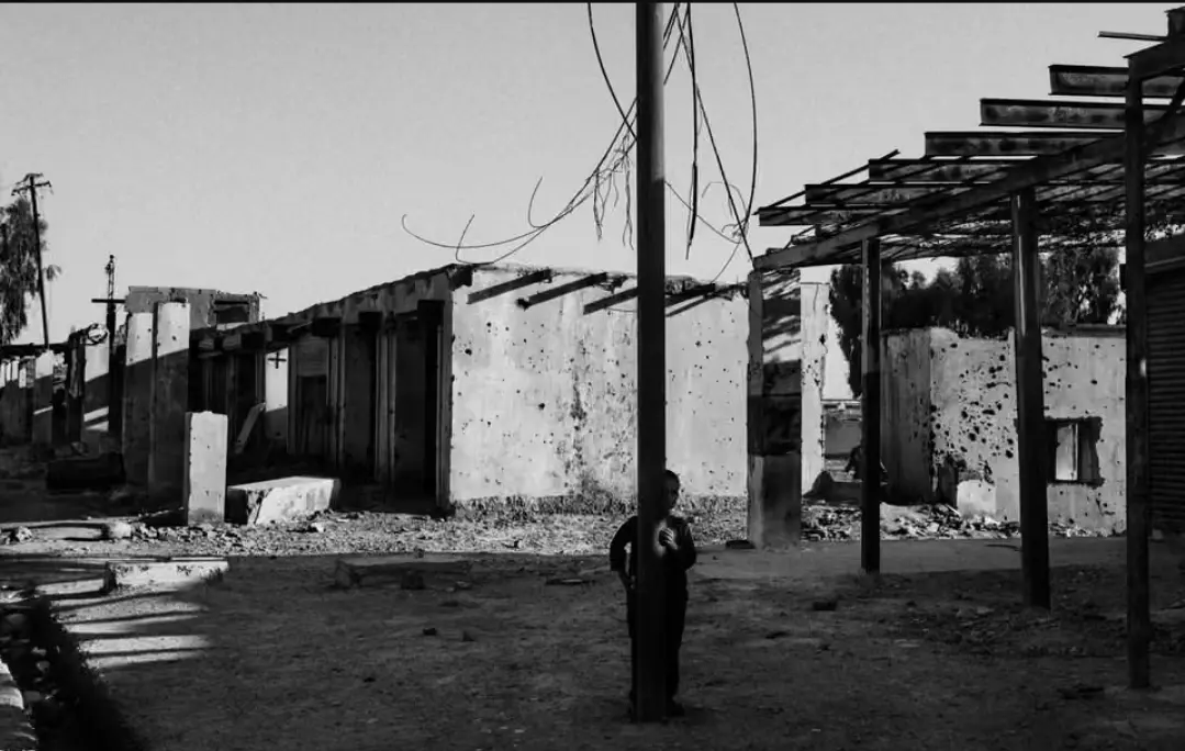 در این عکس بازار شهر سنگین را میبینیم؛ منطقهای که در نتیجهی نبردهای شدید سالهای اشغال آمریکا بهشدت ویران شده . ابعاد جنایتها و نقضهای حقوق بشری که در این مناطق سابق خط مقدم رخ دادهاند، هنوز به روشنی آشکار نشده است.