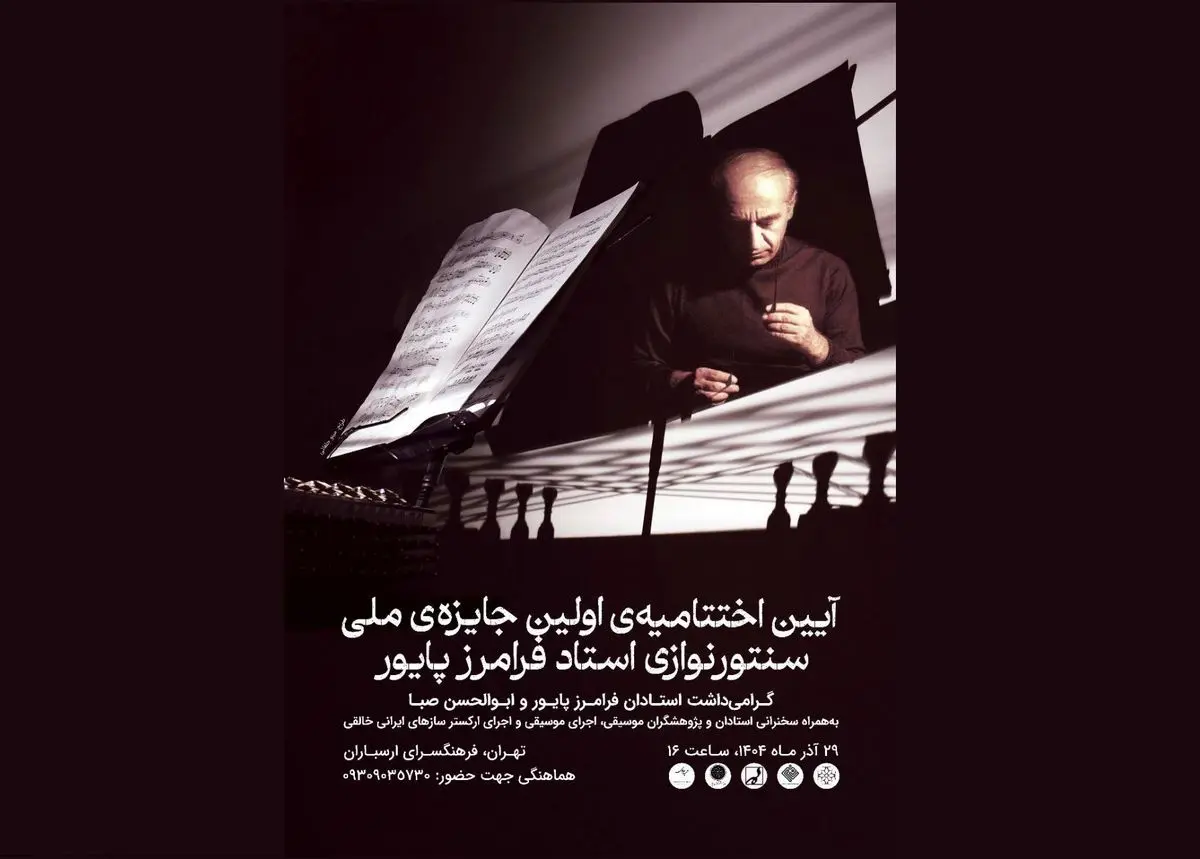 آیین اختتامیهی نخستین جایزه ملی سنتورنوازی فرامرز پایور، ۲۹ آذرماه در فرهنگسرای ارسباران برگزار میشود.